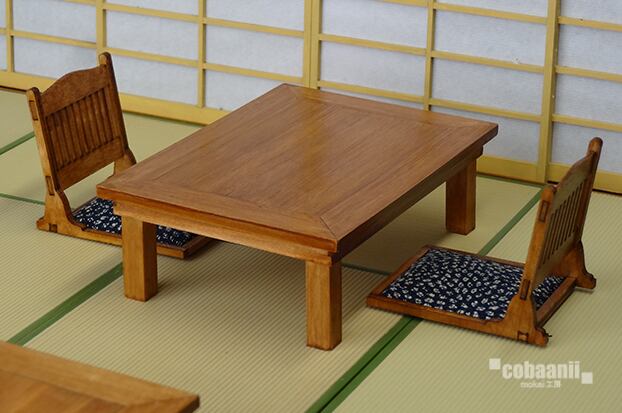 様々な空間にマッチする和モダンの座卓と和柄のクッションの座椅子です。フィギュアを座らせたりドールハウスに使ったり等、様々な場面で活躍ができるアイテムです。